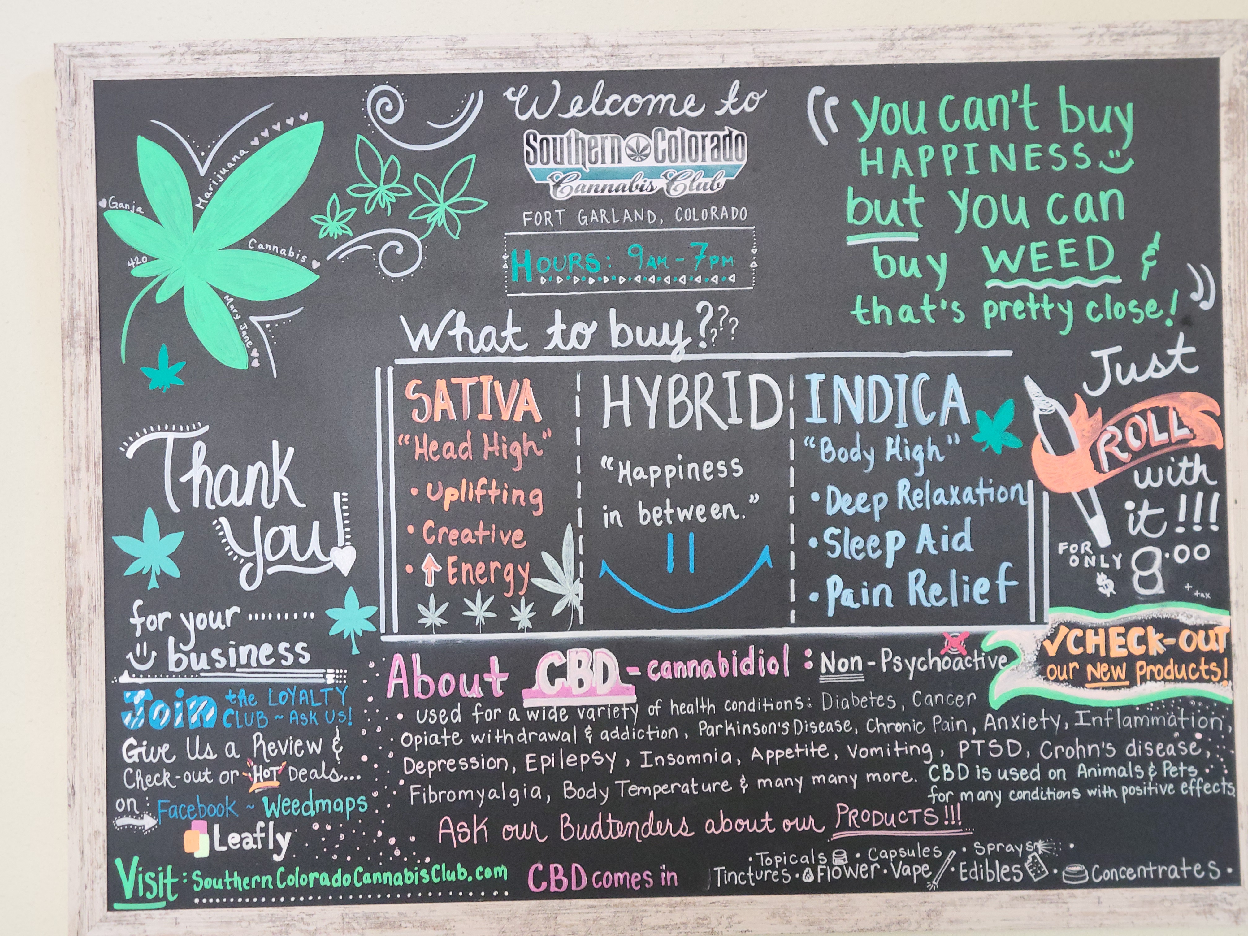 Open 9:00 A.M. to 7:00 P.M. Open everyday of the week. The Southern Colorado Cannabis Club has the coolest ceiling in Fort Garland! Check out that coppery beauty in the pic above, but you have to see it in person. Be sure to take advantage of their Daily Deals! On Sundays you can choose any Daily Deal from earlier in the same week.